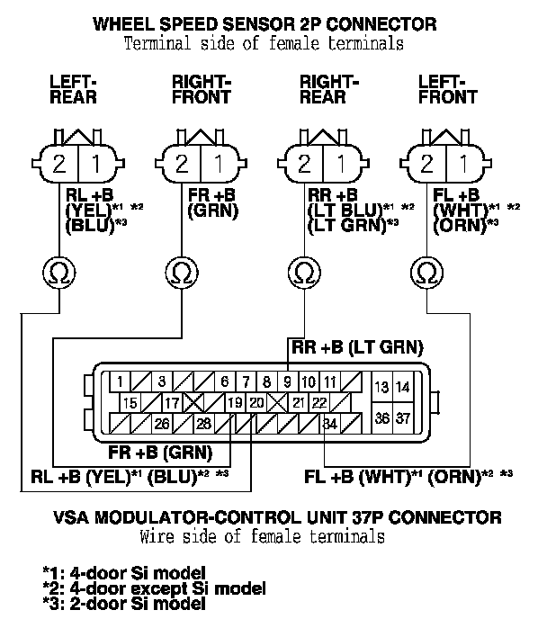 8. Check for continuity between the appropriate VSA modulator-control unit 37P connector wheel speed sensor +B and GND terminals (see table).