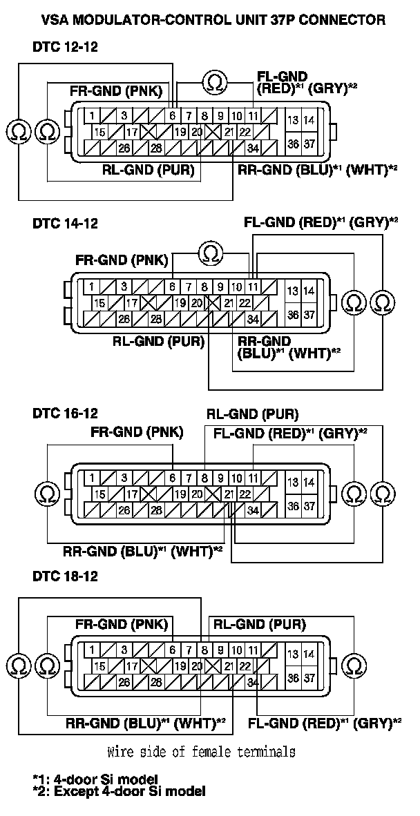 7. Check for continuity between the appropriate VSA modulator-control unit 37P connector wheel speed sensor GND terminals (see table).