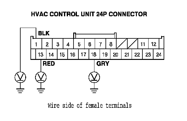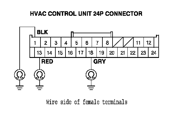 8. Check for continuity between body ground and the HVAC control unit 24P connector terminals No. 1, 13, and 18 individually.