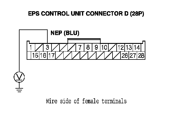 6. Measure the voltage between EPS control unit connector D (28P) terminal No. 3 and body ground.