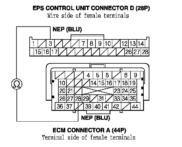 11. Check for continuity between EPS control unit connector D (28P) terminal No. 3 and ECM connector A (44P) terminal No. 28.