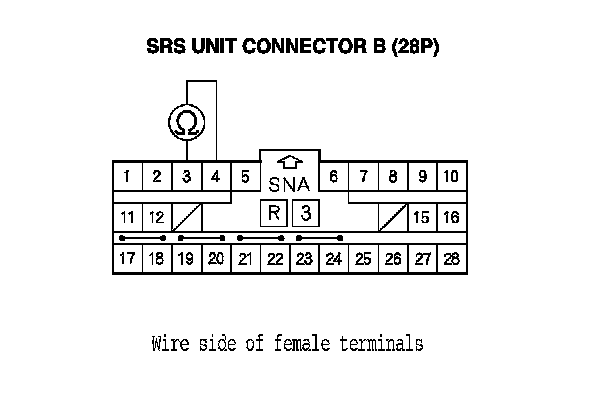 12. Measure the resistance between SRS unit connector B (28P) terminals No. 3 and No. 4. There should be 2.0-3.0 Ohms.