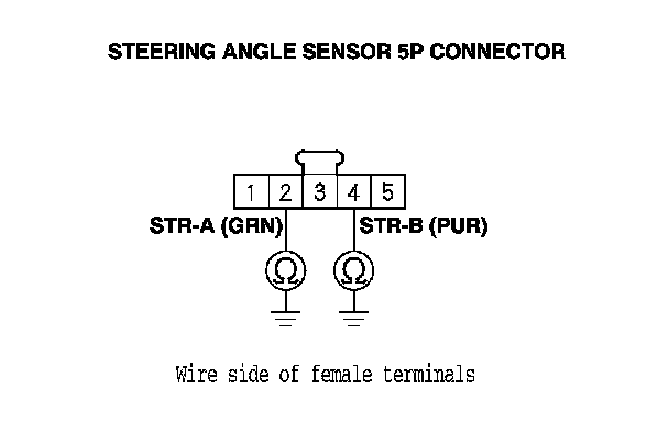 6. Check for continuity between body ground and steering angle sensor 5P connector terminals No. 2 and No. 4 individually.