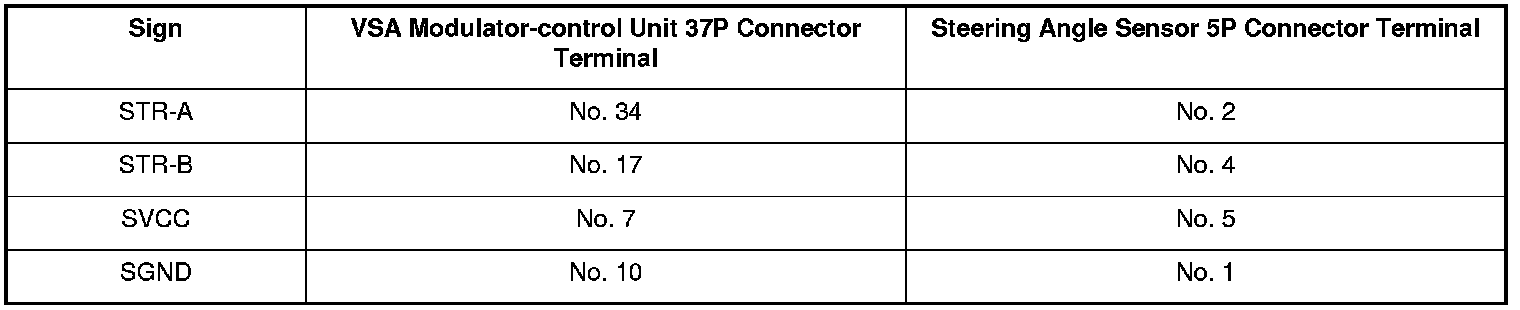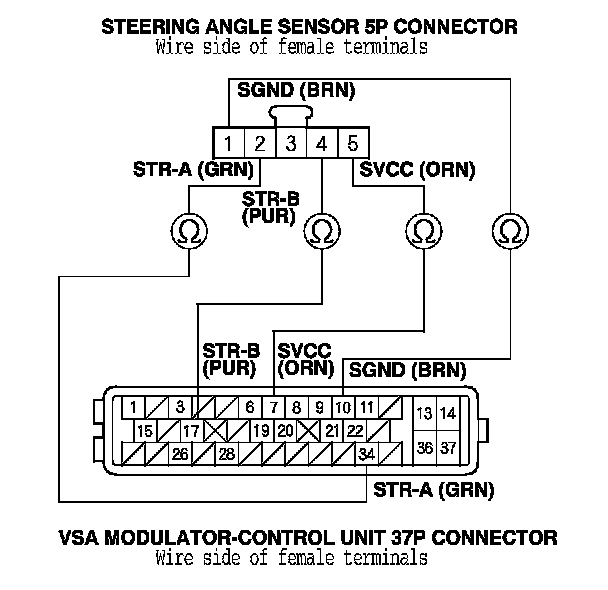 7. Check for continuity between the VSA modulator-control unit 37P connector terminal and the steering angle sensor 5P connector terminal individually.