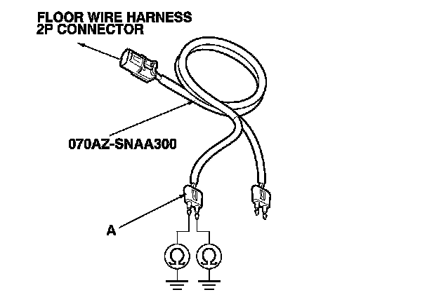 13. Measure the resistance between each terminal of the black SRS simulator lead (A) and body ground. There should be an open circuit or at least 1 MOhms.