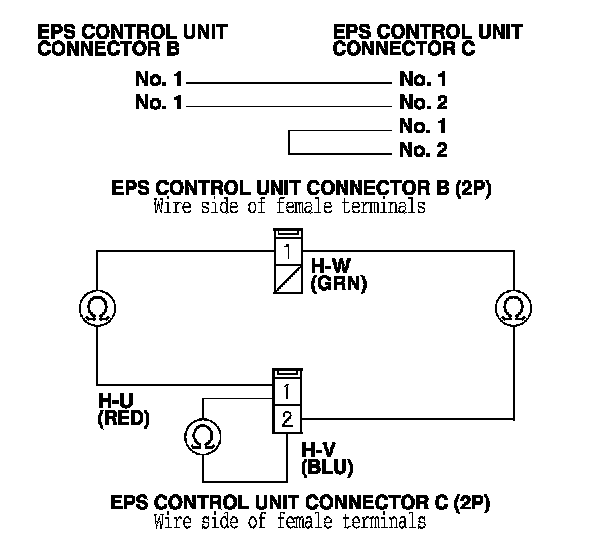 11. On the EPS motor side, check for continuity between the following terminals of the EPS motor 1P and EPS motor 2P connector.