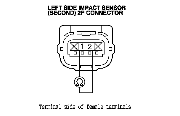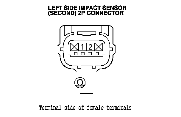 10. Measure the resistance between left side impact sensor (second) 2P connector terminals No. 1 and No. 2. There should be an open circuit or at least 1 MOhms.