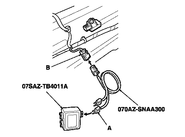 16. Connect the SRS inflator simulator (jumper connector) and the red lead (A) of simulator lead L to the rear safing sensor 4P connector (B).