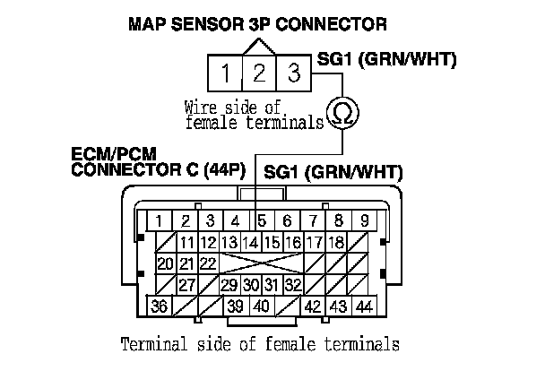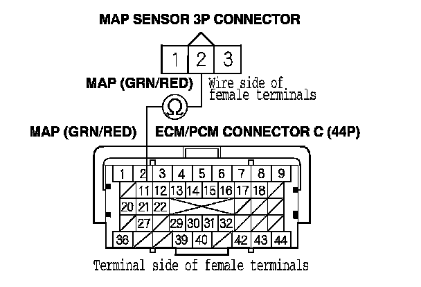 13. Check for continuity between ECM/PCM connector terminal C14 and MAP sensor 3P connector terminal No. 3.