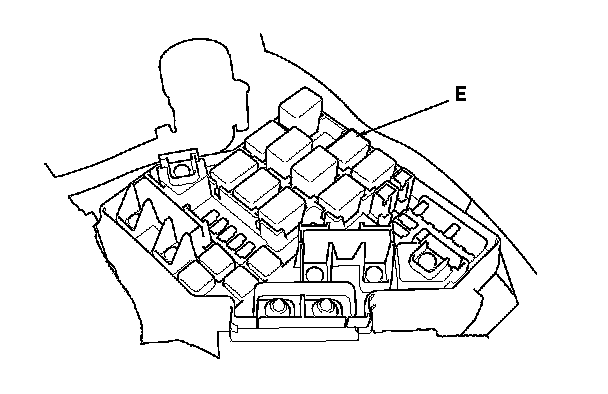 14. Remove the PGM-FI subrelay (E) from the under-hood fuse/relay box.