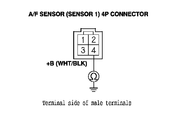 10. At the sensor side, check for continuity between A/F sensor (Sensor 1) 4P connector terminals No. 1 and No. 3, and between terminals No. 1 and No. 4 individually.