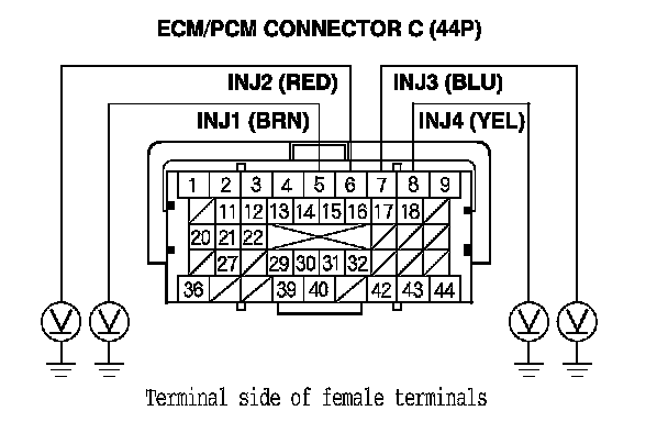 31. Measure the voltage between body ground and the appropriate ECM/PCM connector terminal of the problem cylinder (see table).