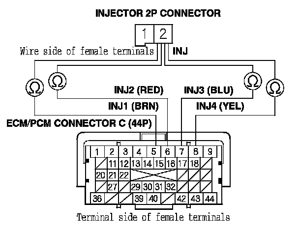 38. Check for continuity between appropriate injector 2P connector terminal No. 2 and the appropriate ECM/PCM connector terminal of the problem cylinder (see table).