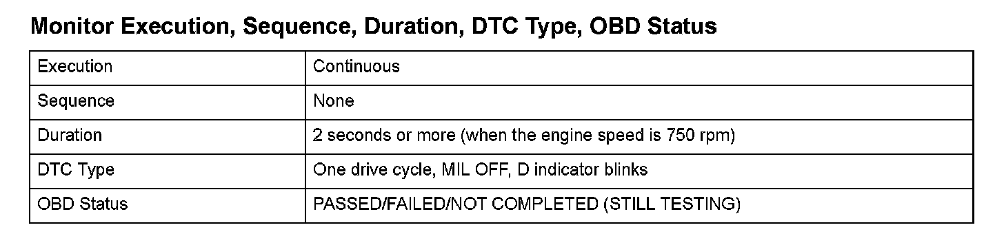 Monitor Execution, Sequence, Duration, DTC Type, OBD Status