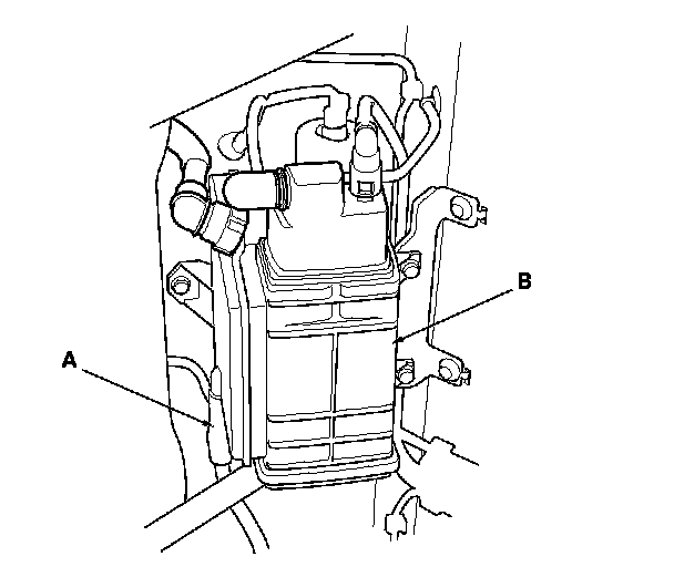 22. Reconnect the fresh air hose (A) to the EVAP canister (B).