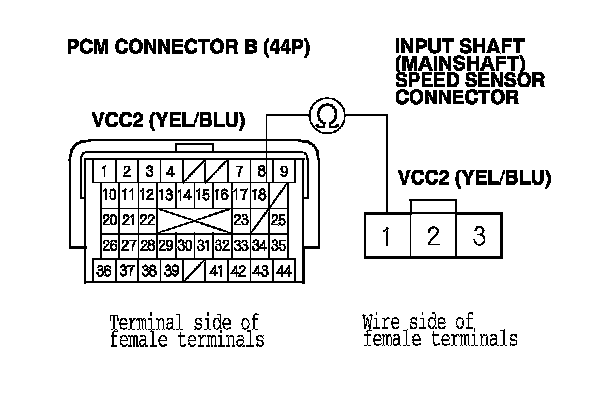25. Check for continuity between PCM connector terminal B33 and input shaft (mainshaft) speed sensor connector terminal No. 3.