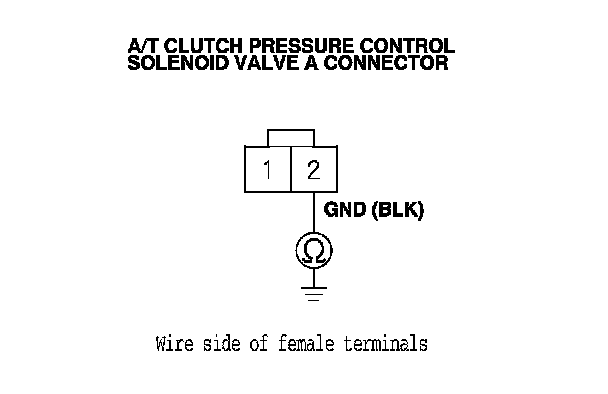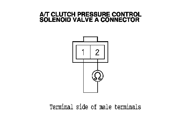 10. Measure the resistance between A/T clutch pressure control solenoid valve A connector terminals No. 1 and No. 2.
