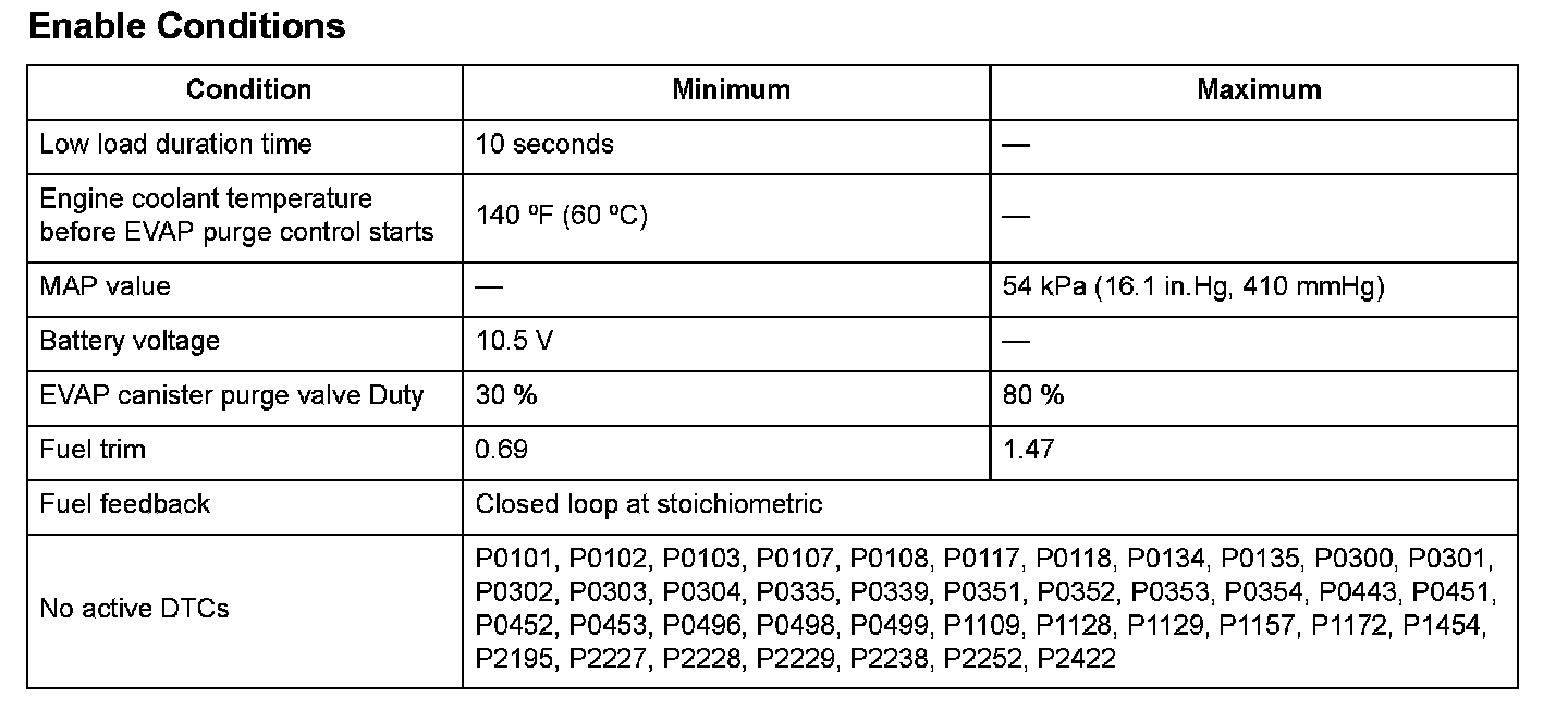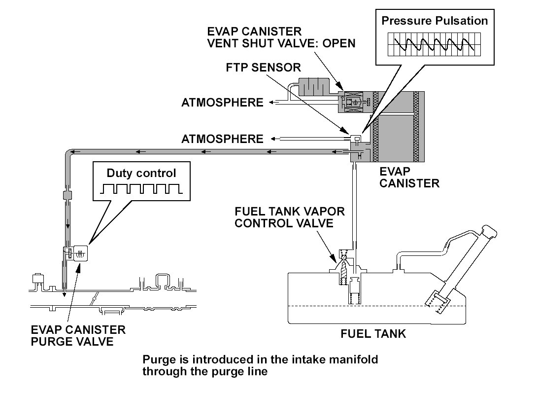 The fuel vapor in the fuel tank is temporarily stored in the evaporative emission (EVAP) and introduced in the engine through the EVAP canister purge valve. The engine control module (ECM)/powertrain control module (PCM) controls the amount of vapor introduced into the engine by varying the duty cycle to the EVAP canister purge valve according to the condition of the engine.