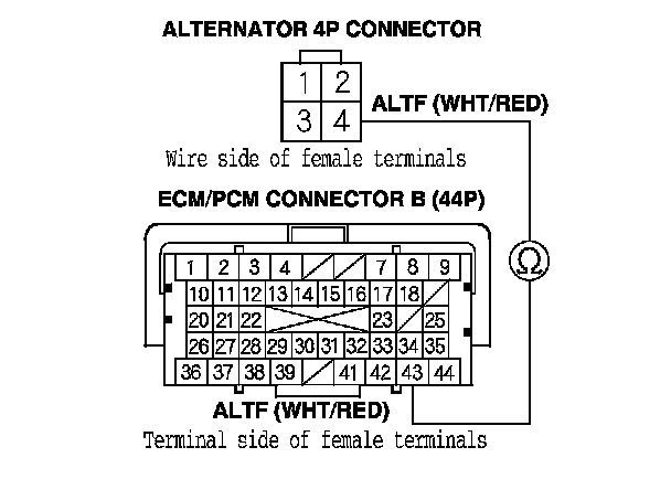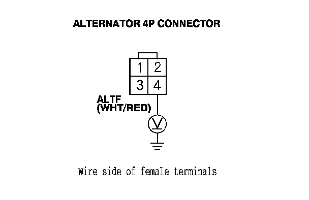 1. Check for poor connections or loose terminals at the alternator 4P connector.