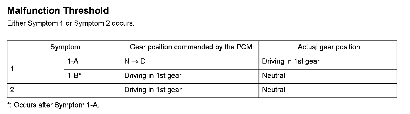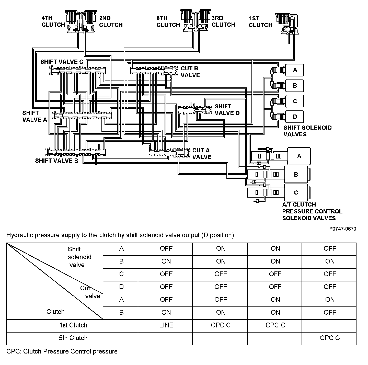 Cut valve A and cut valve B is installed in the hydraulic control circuit in the transmission. Cut valve A and cut valve B sup- plies line pressure and clutch pressure control pressure to the 1st clutch or the 5th clutch according to the combination of the solenoid signal. When the signal to shift solenoid valve A from the powertrain control module (PCM) is ON, and line pressure is applied to shift valve A, it operates against the shift valve A spring. When the signal to shift solenoid valve A from the PCM is OFF, and line pressure is discharged, shift valve A is inactive. When cut valve A is once active, it is self-locked by the line pressure which is supplied only in case of the D position. Cut valve A is switch to inactive side due to pressure supplied to the 1st clutch. When the pressure is supplied to the 1st clutch, cut valve B operates against the spring. When the pressure is not supplied to the 1st clutch, cut valve B is inactive. When cut valve B is once active, it is self-locked by the line pressure which is supplied only in case of the D position. Cut valve B is switched to inactive side when the signal to shift solenoid C from the PCM is ON. The signal from the PCM is output to apply clutch pressure control pressure to the proper gear change clutch according to the gear change schedule. The PCM monitors the input shaft (mainshaft) speed and the output shaft (counter-shaft) speed at the gear change which is decided according to the shift schedule. When an improper gear ratio is output compared to the predetermined gear change mode, the cut valve A ON failure or the cut valve B OFF failure is detected and a DTC is stored.
