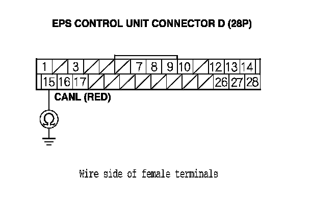 13. Check for continuity between EPS control unit connector D (28P) terminal No. 15 and body ground.