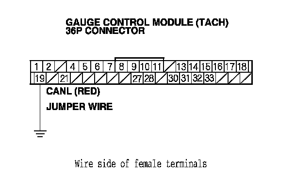 11. Connect gauge control module (tach) 36P connector terminal No. 19 to body ground with a jumper wire.