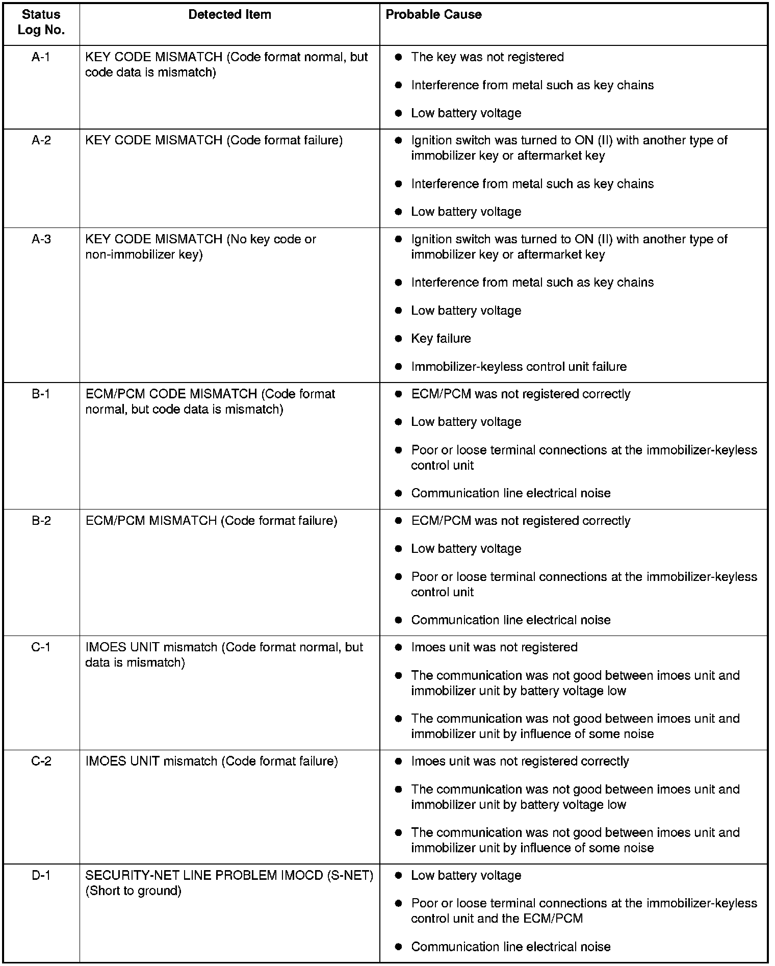 Immobilizer System Status Log