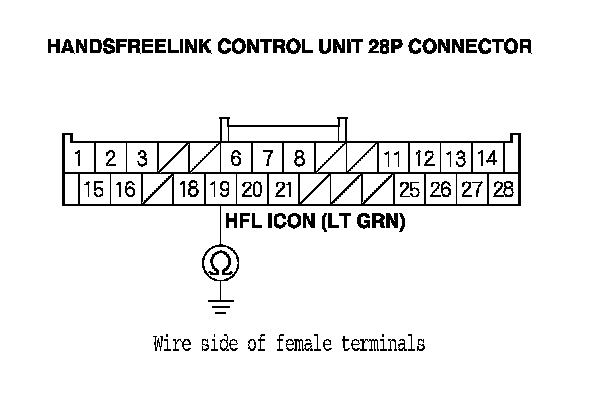 3. Check for continuity between body ground and the HandsFreeLink control unit 28P connector terminal No. 19.