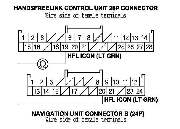 4. Check for continuity between HandsFreeLink control unit 28P connector terminal No. 19 and navigation unit connector B (24P) terminal No. 20.