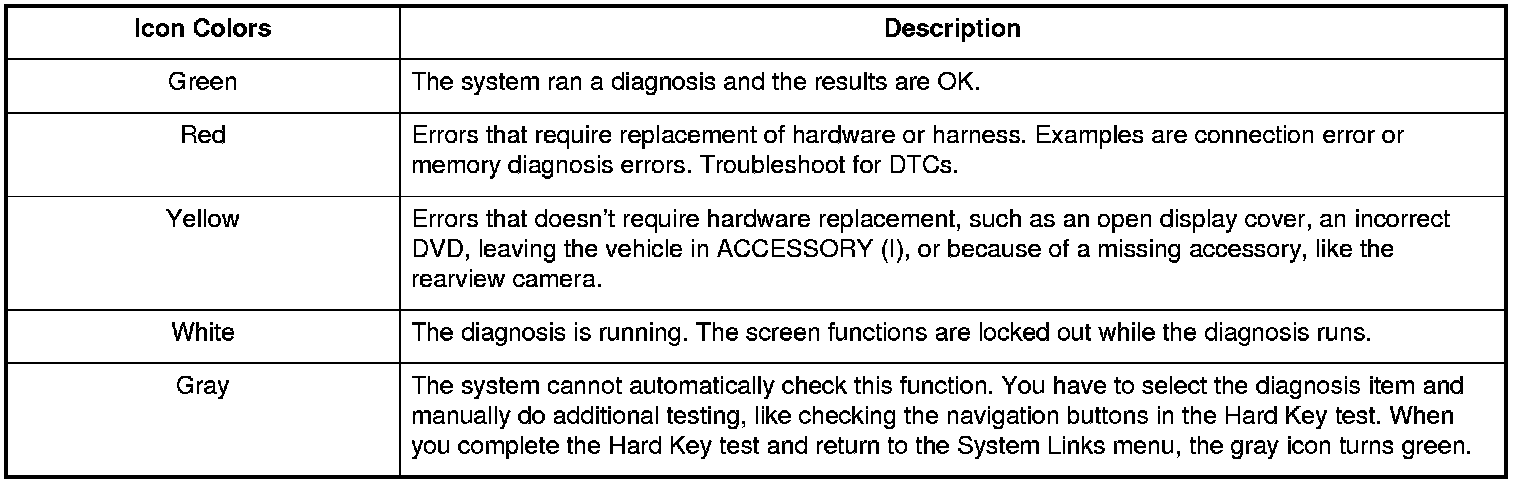 When the diagnostic finishes, the icons turn different colors based on their test status. The color definitions are shown below and can also be seen by selecting Help on the System Links screen.