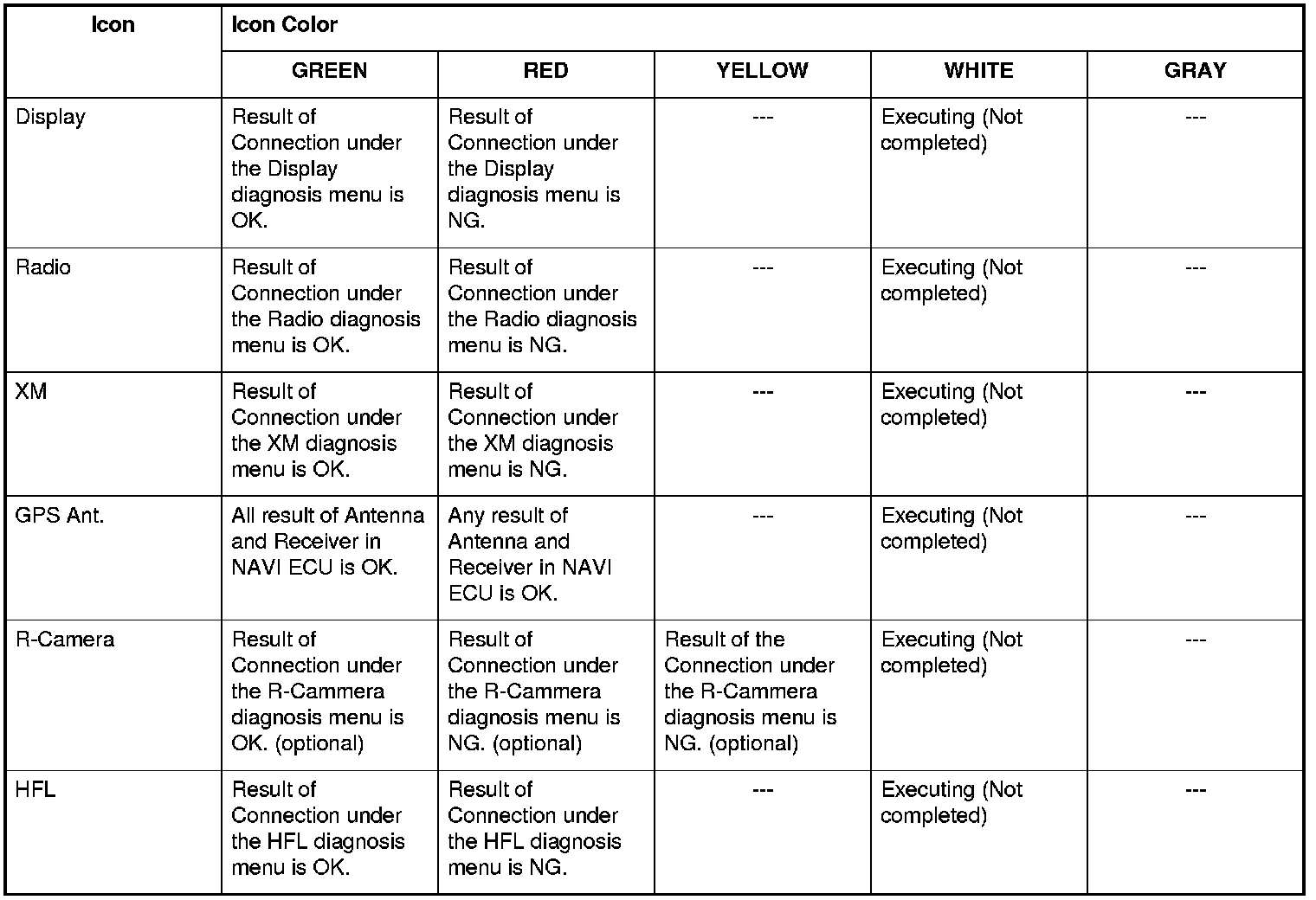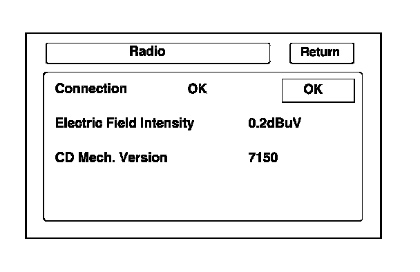 This diagnostic screen checks the internals of the radio (AM and FM) and CD player. If NG, replace the navigation unit.