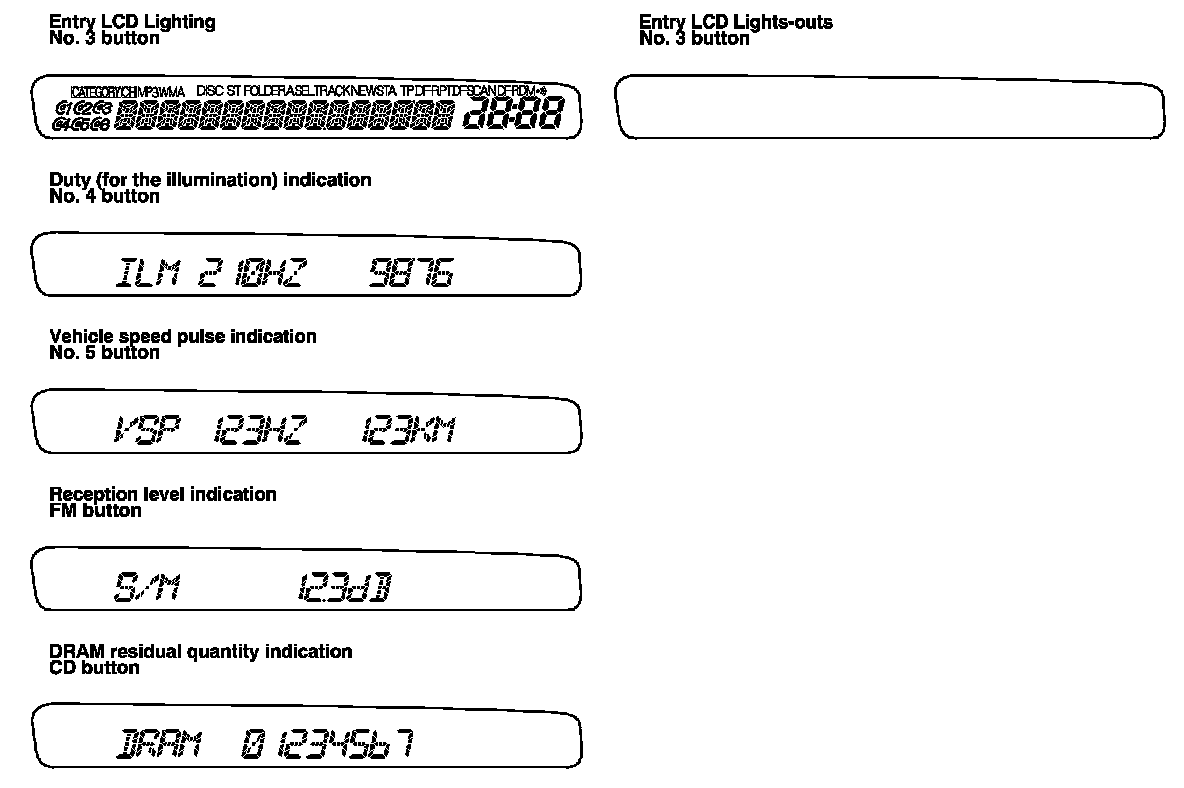 Entire LCD lighting/light-out mode: Turns on/off the entire LCD to if a LCD segment is stuck on or dead (off). If a LCD segment is stuck on, or is dead, replace the audio unit.