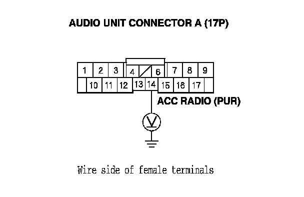 6. Measure the voltage between audio unit connector A (17P) terminal No. 14 and body ground.
