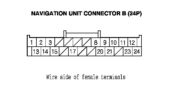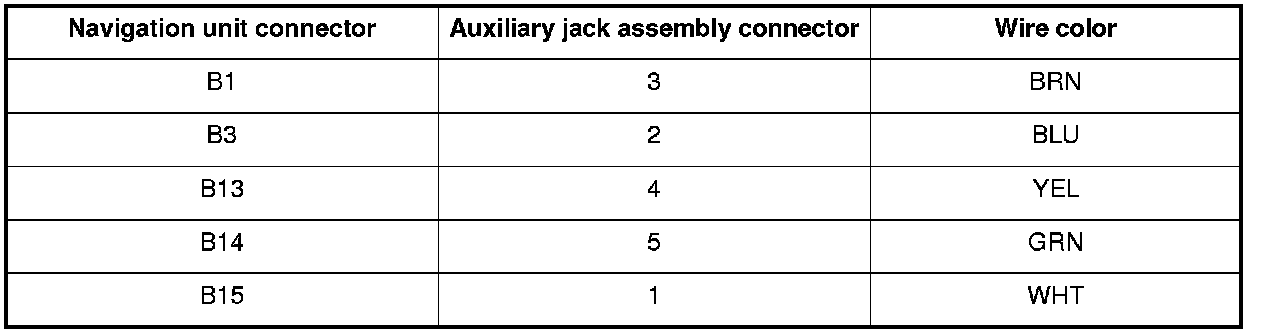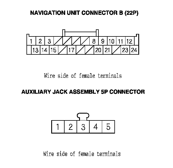12. Check for continuity between navigation unit connector B (24P) and the auxiliary jack assembly 5P connector according to the table.