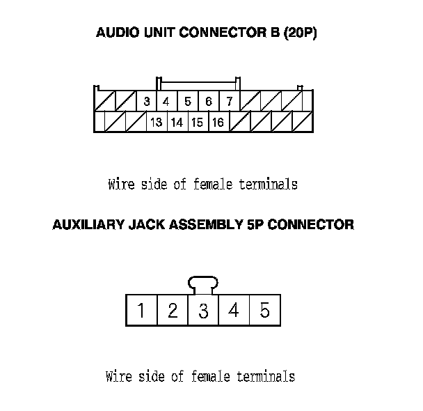 17. Check for continuity between audio unit connector B (20P) and auxiliary jack assembly 5P connector according to the table.