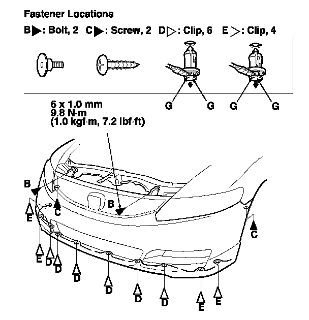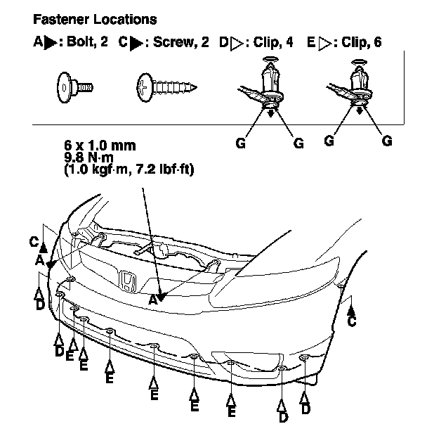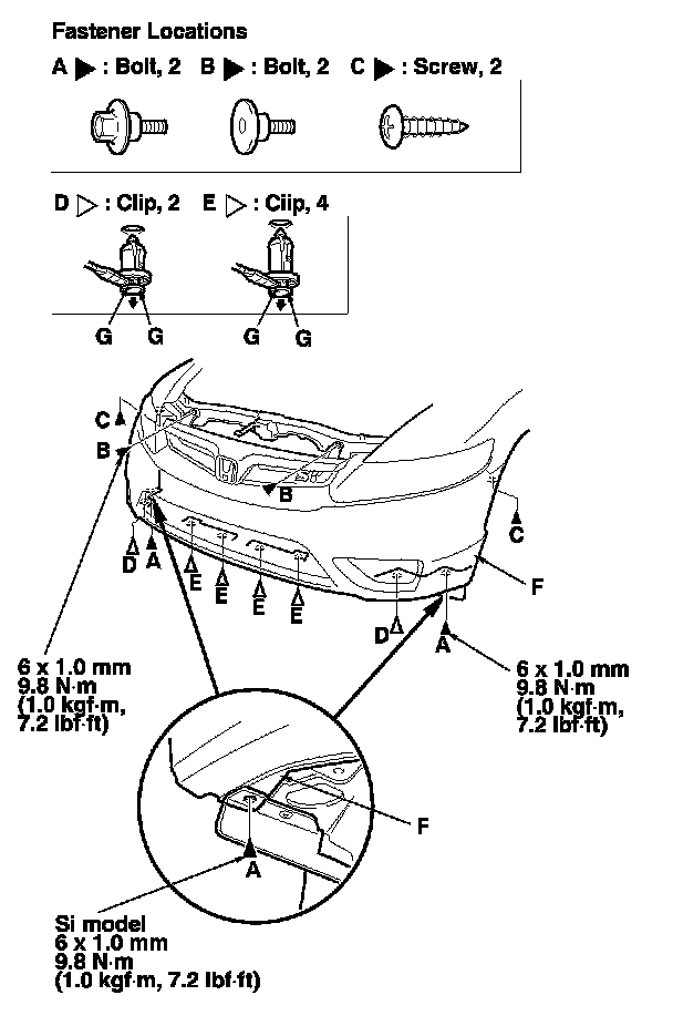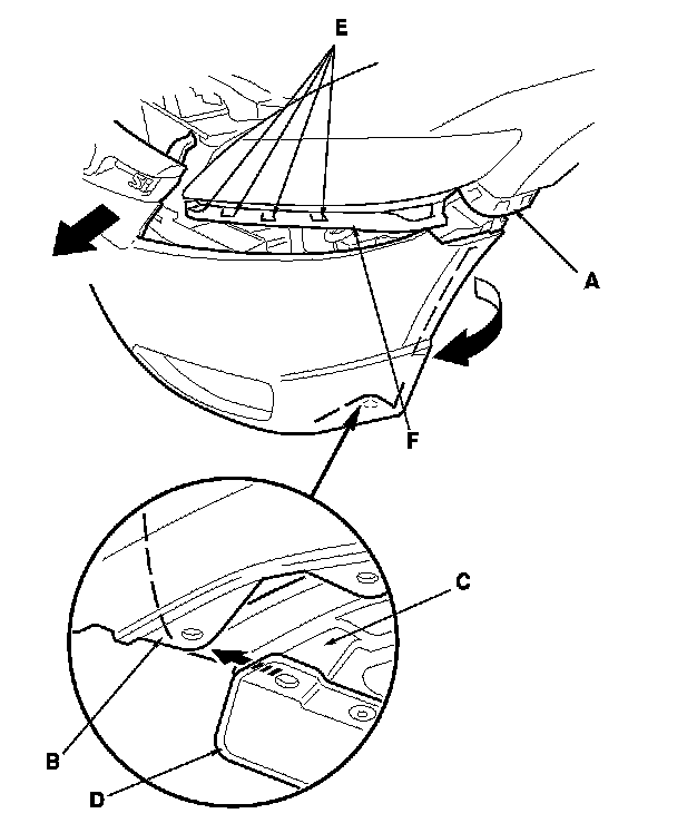 2-door Si models: Hold the lower bumper corners (B) away from the front inner fenders (C) and the front strakes (D). Pull the bumper forward to release it from the hooks (E) on the upper beam (F).