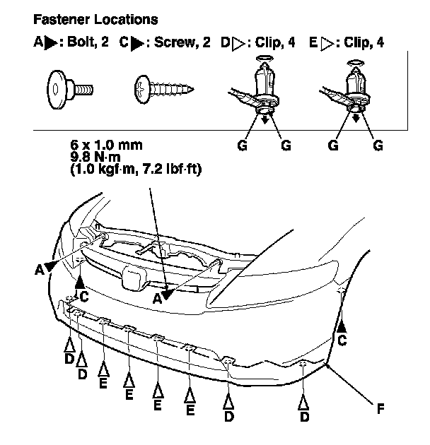 2. Remove the bolts (A, B), screws (C), and clips (D, E) securing the front bumper (F).