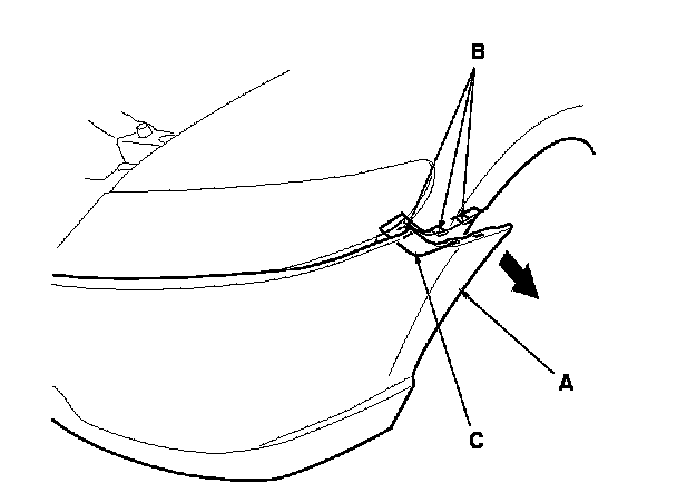 3. Pull on the front bumper (A) at the wheel arch areas to release it from the hooks (B) on the side spacers (C).