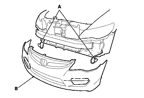 5. If equipped, disconnect the front fog light connectors (A) while holding the front bumper (B), then remove the bumper.