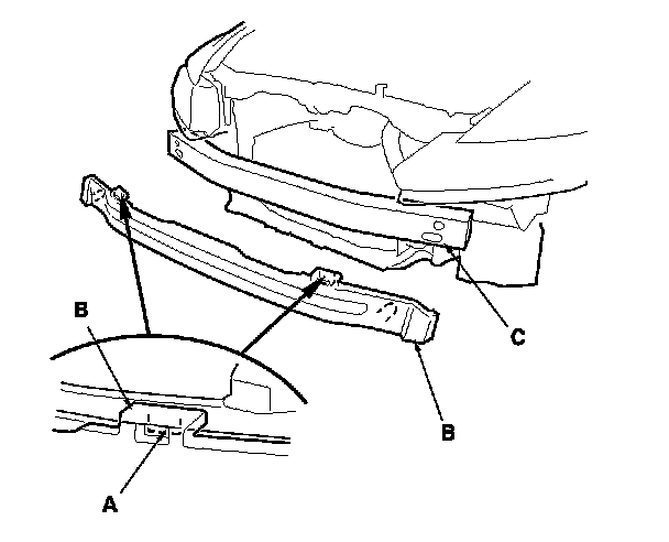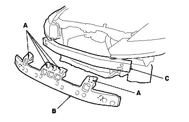 6. Release the hooks (A), then remove the front bumper absorber (B) from the front bumper beam (C).
