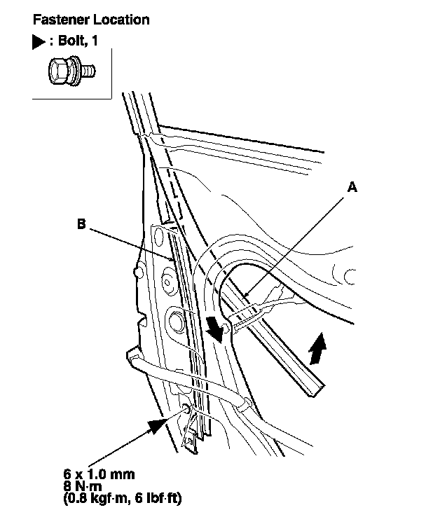 7. Pull the glass run channel (A) away as needed, and remove the bolt, then remove the center lower channel (B) by pulling it downward.