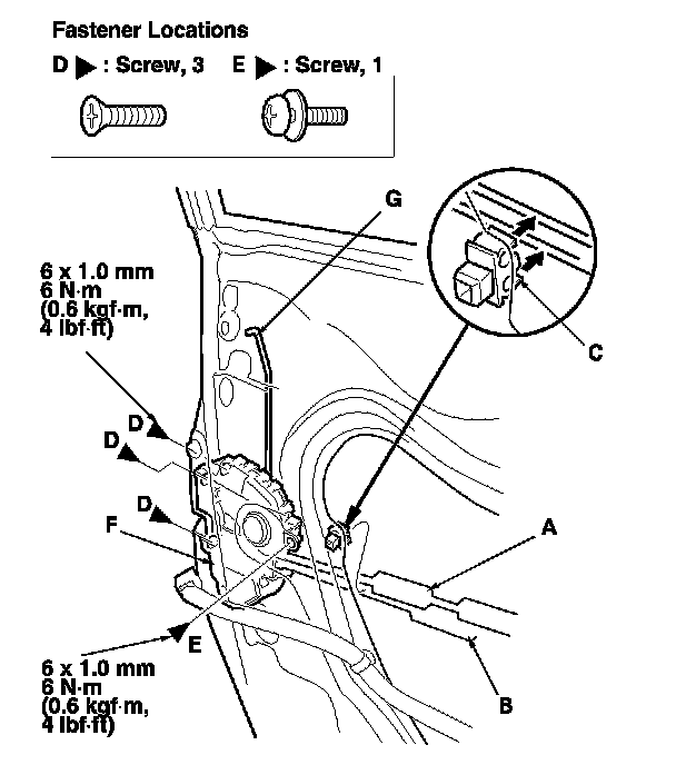8. Detach the latch cable (A) and the inner handle cable (B) from the holder (C), then remove the screws (D, E) securing the latch (F), then remove the latch through the hole in the door. Take care not to bend the outer handle rod (G), the latch cable, or the inner handle cable.
