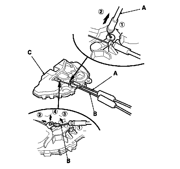10. Detach the latch cable (A) and the inner handle cable (B) from the latch (C).