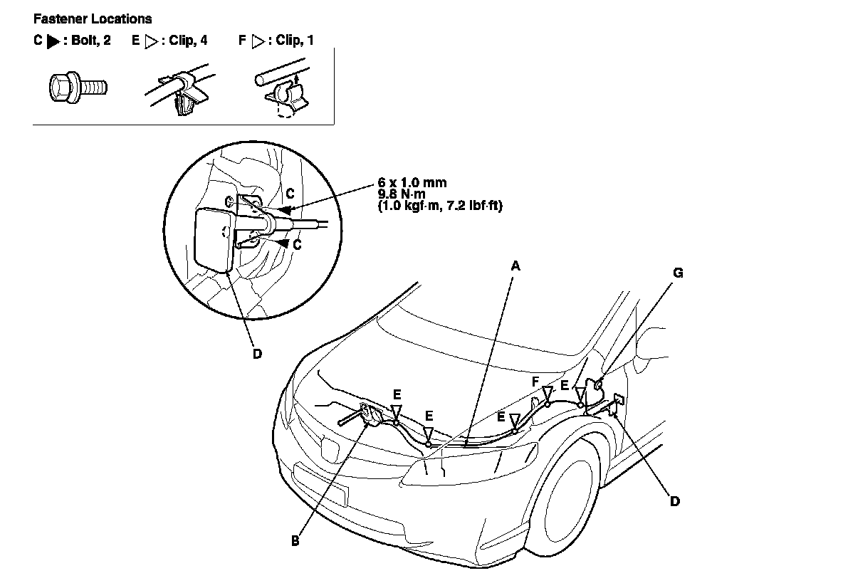 3. Detach the clips (E) using a clip remover, release the hood opener cable from the clip (F), and remove the grommet (G) from the body, then remove the hood opener cable from the vehicle. Take care not to kink the cable.