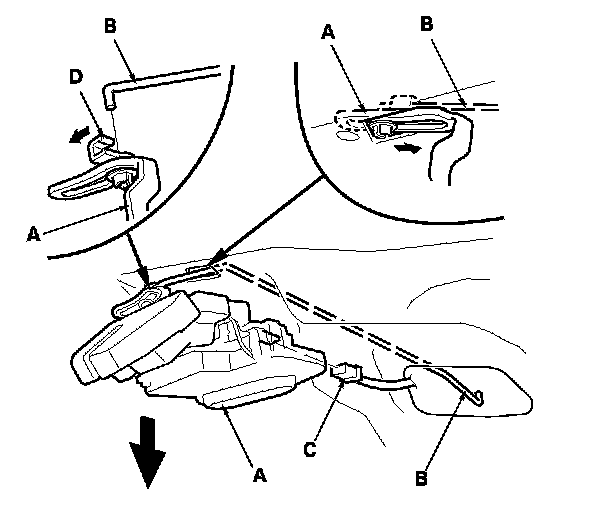 5. Pull the trunk lid latch (A) out, and disconnect the cylinder rod (B) from the trunk lid latch. If equipped, disconnect the latch switch connector (C). Take care not to bend the cylinder rod.