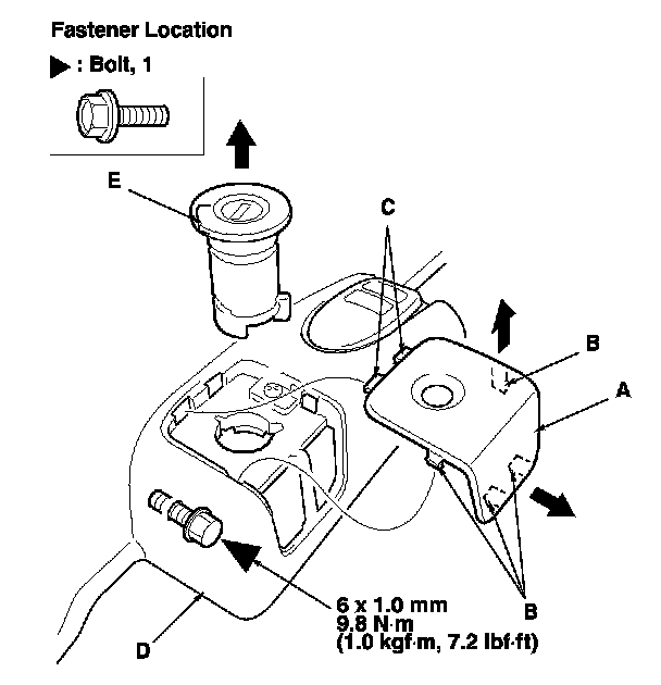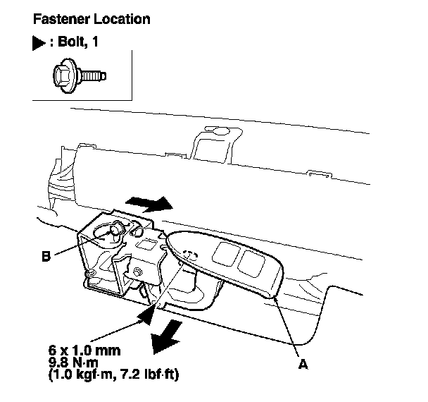 5. Remove the bolt, then remove the trunk lid opener/fuel fill door opener (A) from the bolt (B).