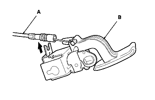 6. Disconnect the trunk lid opener/fuel fill door opener cable (A), then remove the opener (B). Take care not to kink the cable.