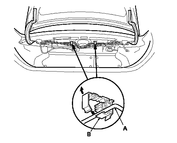 3. Put on gloves to protect your hands. Remove the torsion bars with the torsion bar assembly tool from both trunk lid hinges. First remove the left torsion bar (A), then remove the right torsion bar (B).