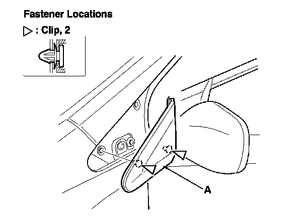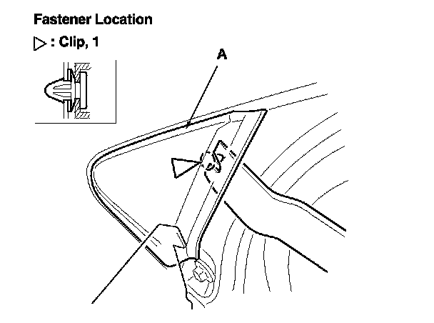 2. Insert an appropriate trim tool under the A-pillar corner trim (A) near the upper clip. Carefully pry up on the trim to release the clip. Take care not to scratch the body and related parts.