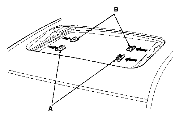 7. Remove both front sunshade base sliders (A) and both rear sunshade base sliders (B).